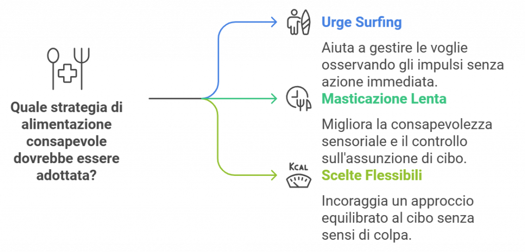• Urge Surfing: Quando un paziente avverte una forte voglia di cibo, è utile insegnare la tecnica dell’“urge surfing”, che consiste nel “cavalcare” l’impulso a mangiare, osservandolo con consapevolezza senza agire immediatamente, riconoscendo che l’urgenza è di fatto soltanto una sensazione temporanea che tende sicuramente a dissiparsi con il tempo.